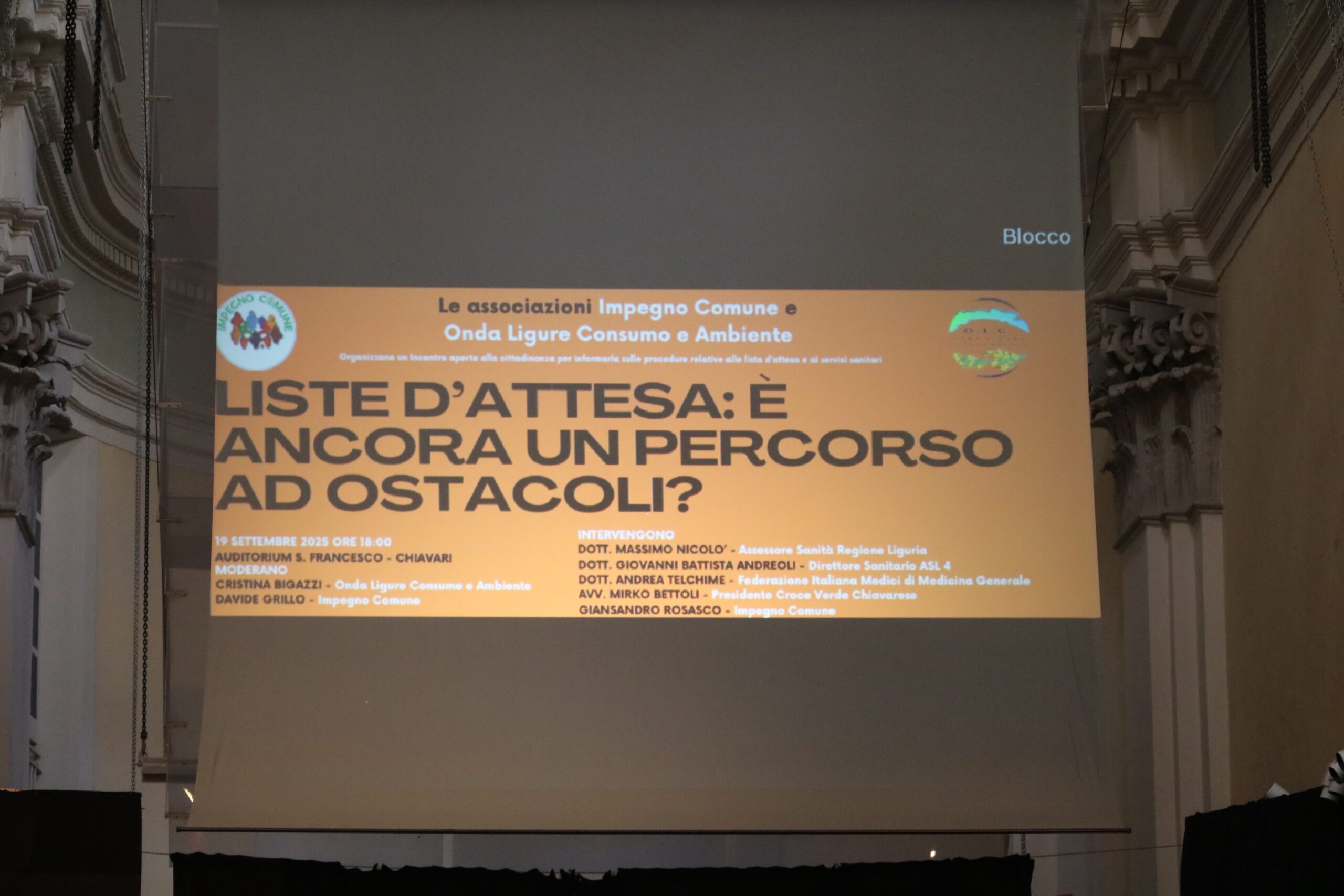 Venerdì 19 Settembre, Onda Ligure – Consumo & Ambiente e Impegno Comune hanno organizzato il Convegno aperto alla cittadinanza “LISTE D’ATTESA è ancora un percorso ad ostacoli?“, al quale hanno preso parte l’Avv. Luigi Bertorello di ASL 4, il Dott. Cardinale, quale responsabile unico delle liste d’attesa di ASL 4, il Dott. Telchime e l’Avv. Bettoli, Presidente della Croce Verde Chiavarese . L’evento ha altresì visto l’intervento di Cristina Bigazzi, Presidente di Onda Ligure, Davide Grillo e Giansandro Rosasco, entrambi di Impegno Comune.