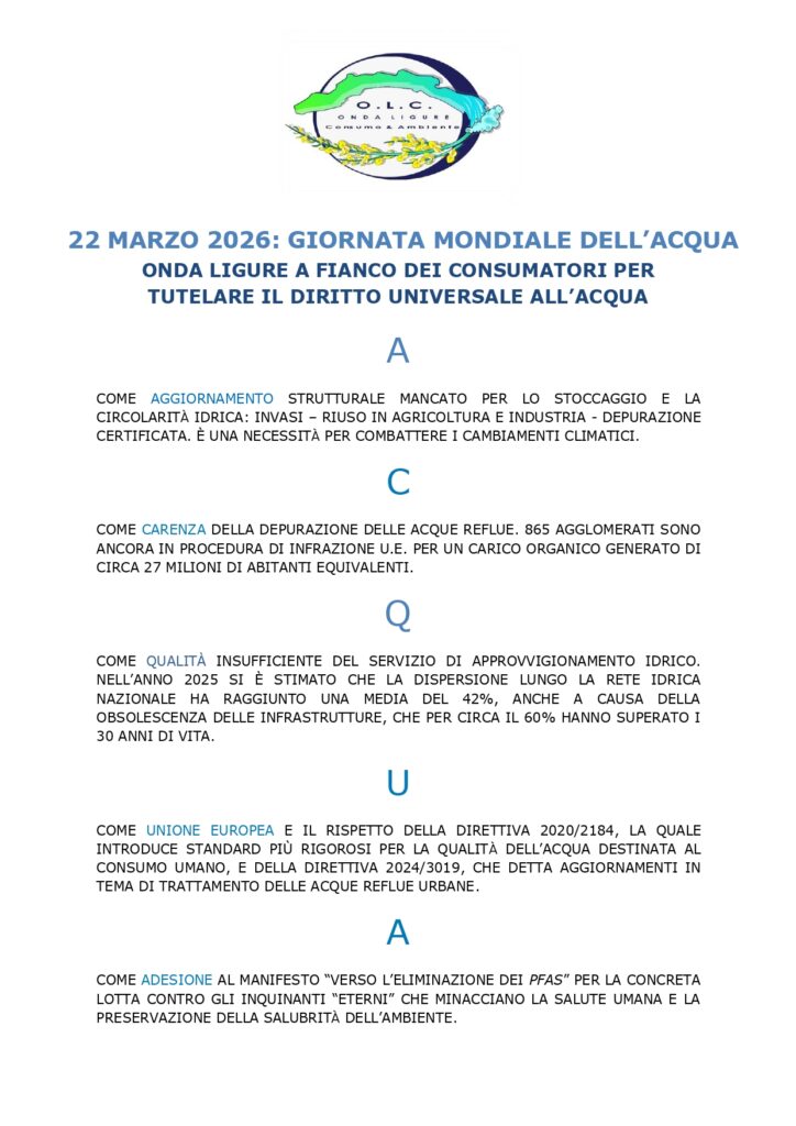 22 marzo 2026: GIORNATA MONDIALE DELL’ACQUA – Onda Ligure a fianco dei consumatori